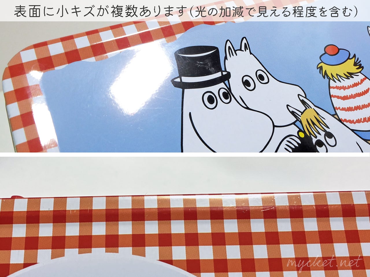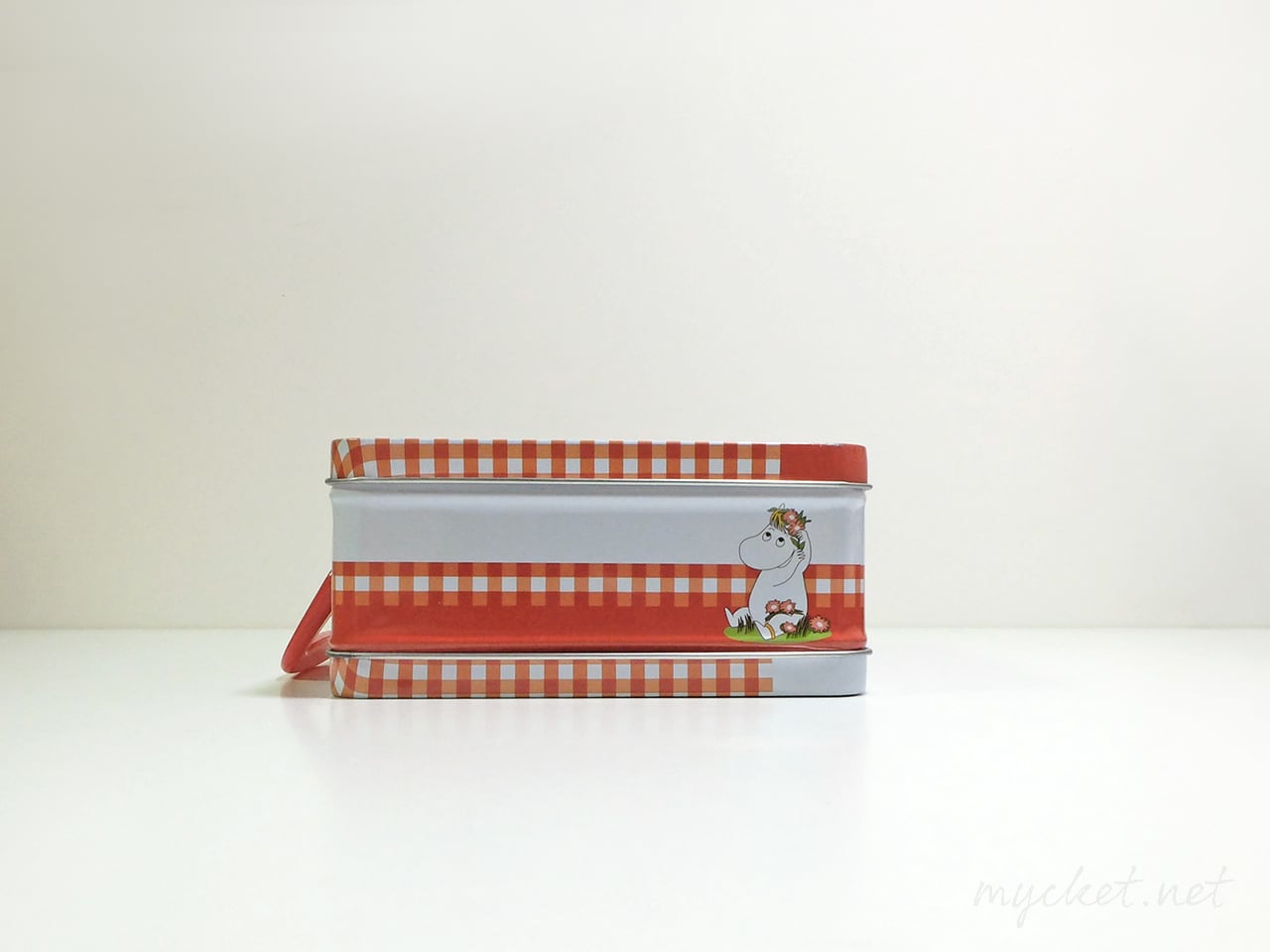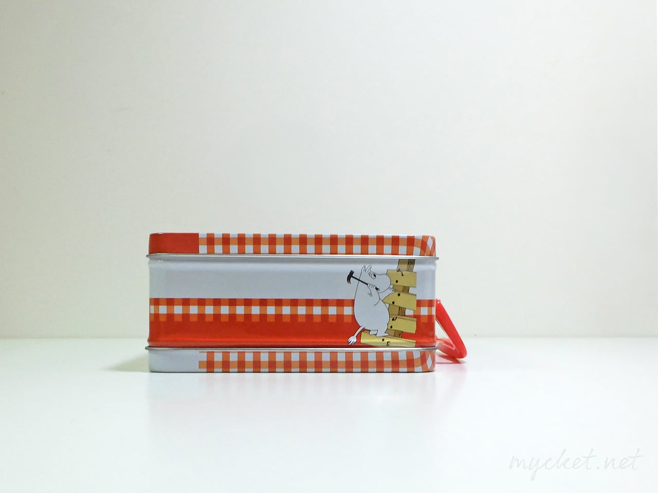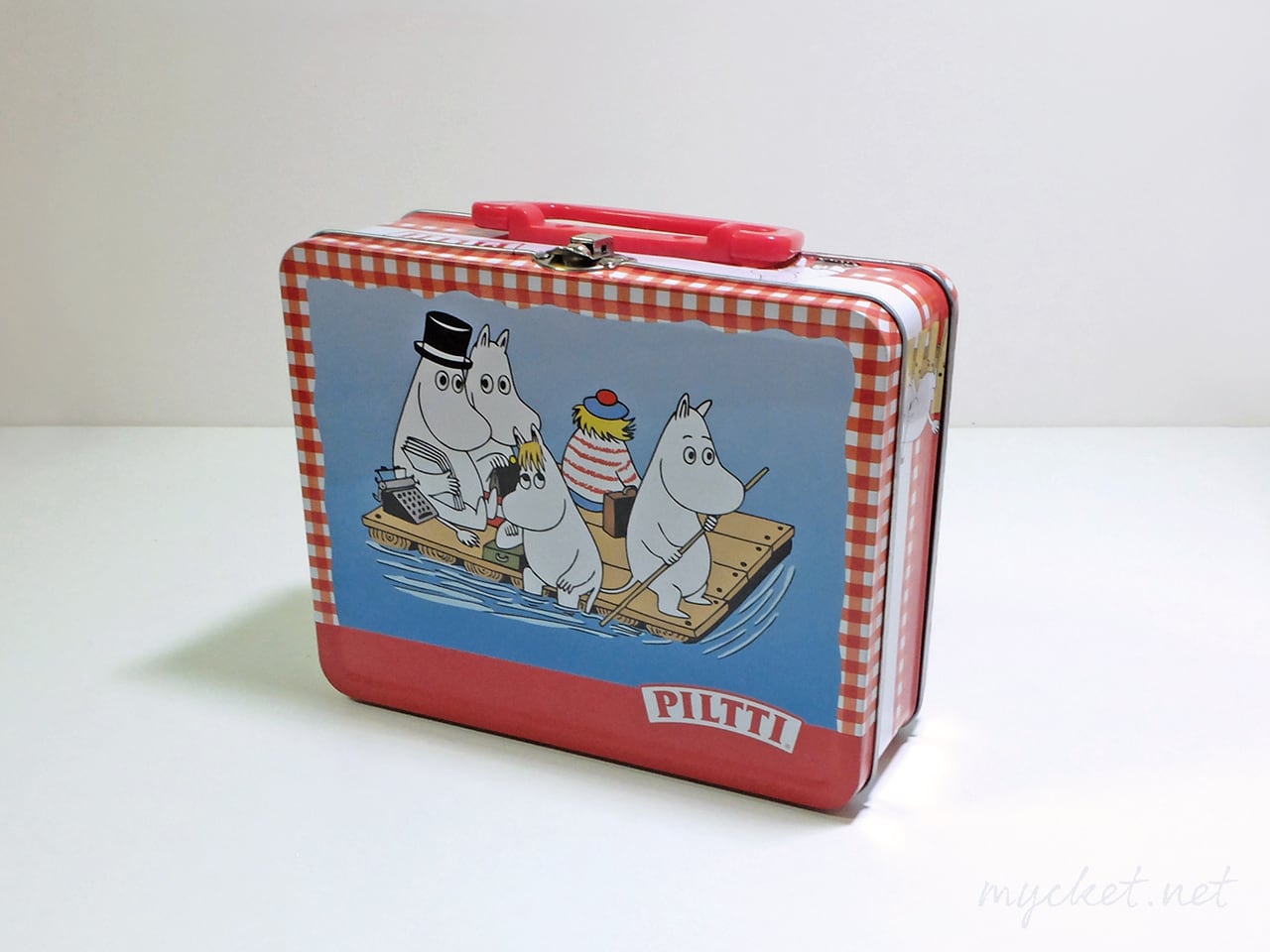 メーカーのパッケージと同じ赤いチェック柄と、ムーミン谷の仲間たちが6面にプリントされています。