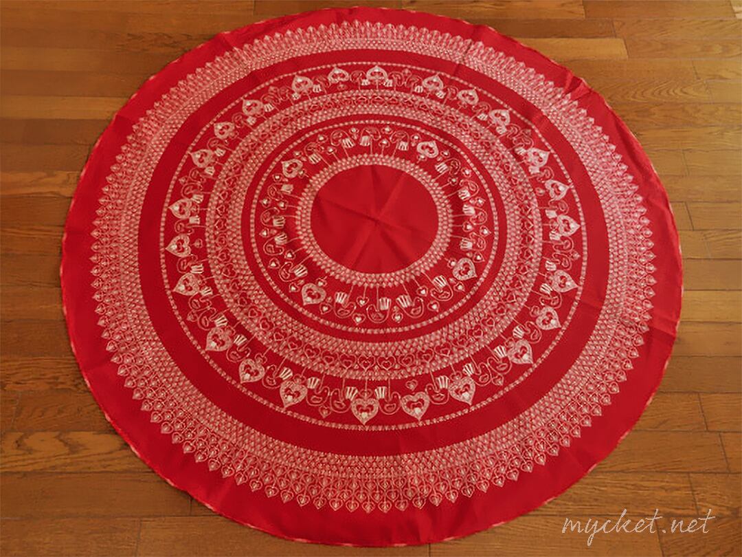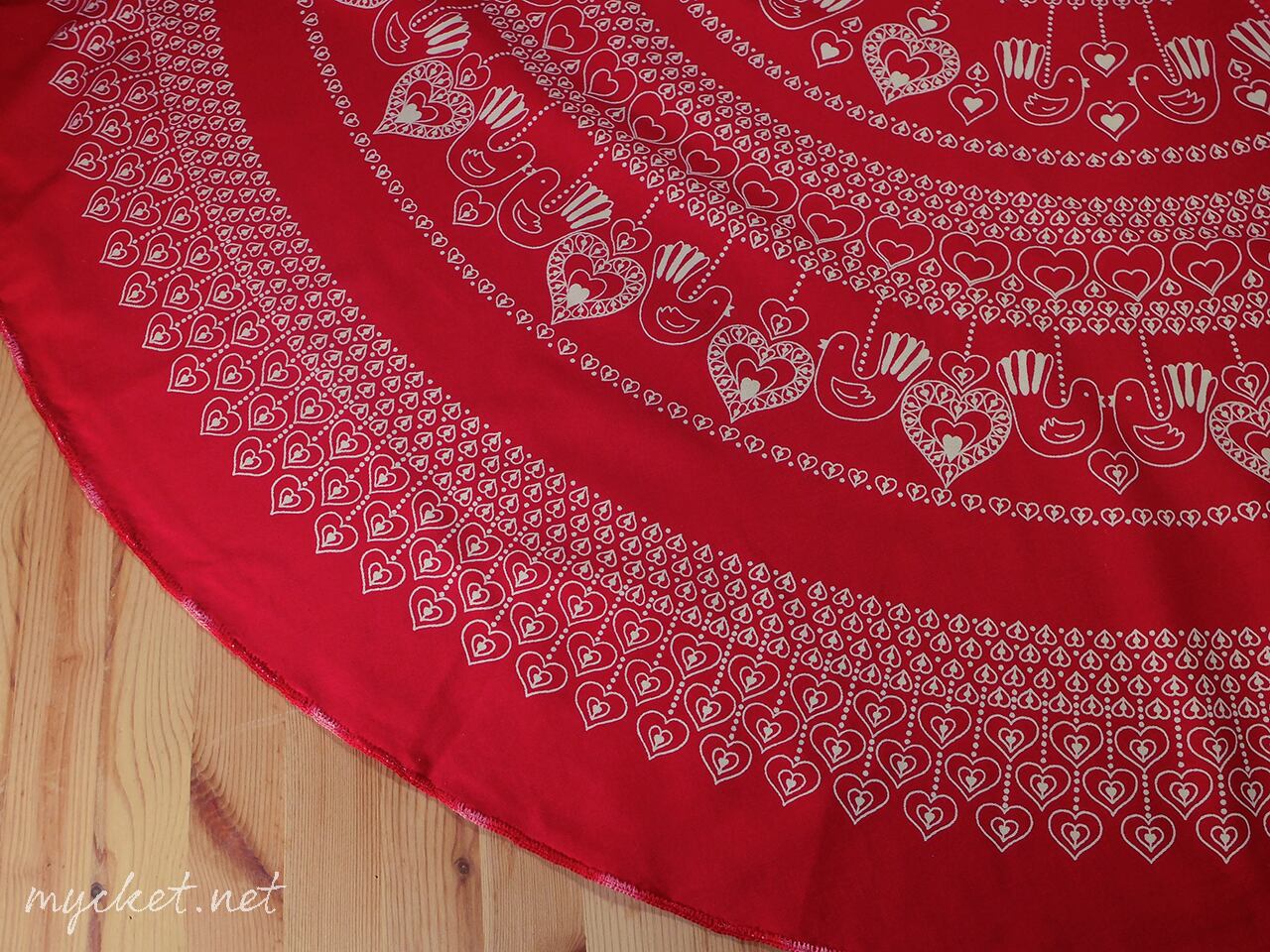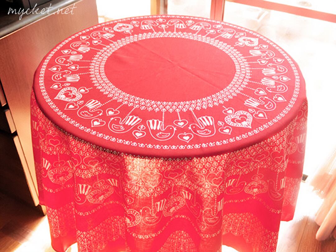 フィンランドで見つけた、鳥とハート模様の円形クロス(ユーズド/テーブルクロス/プリント/赤)