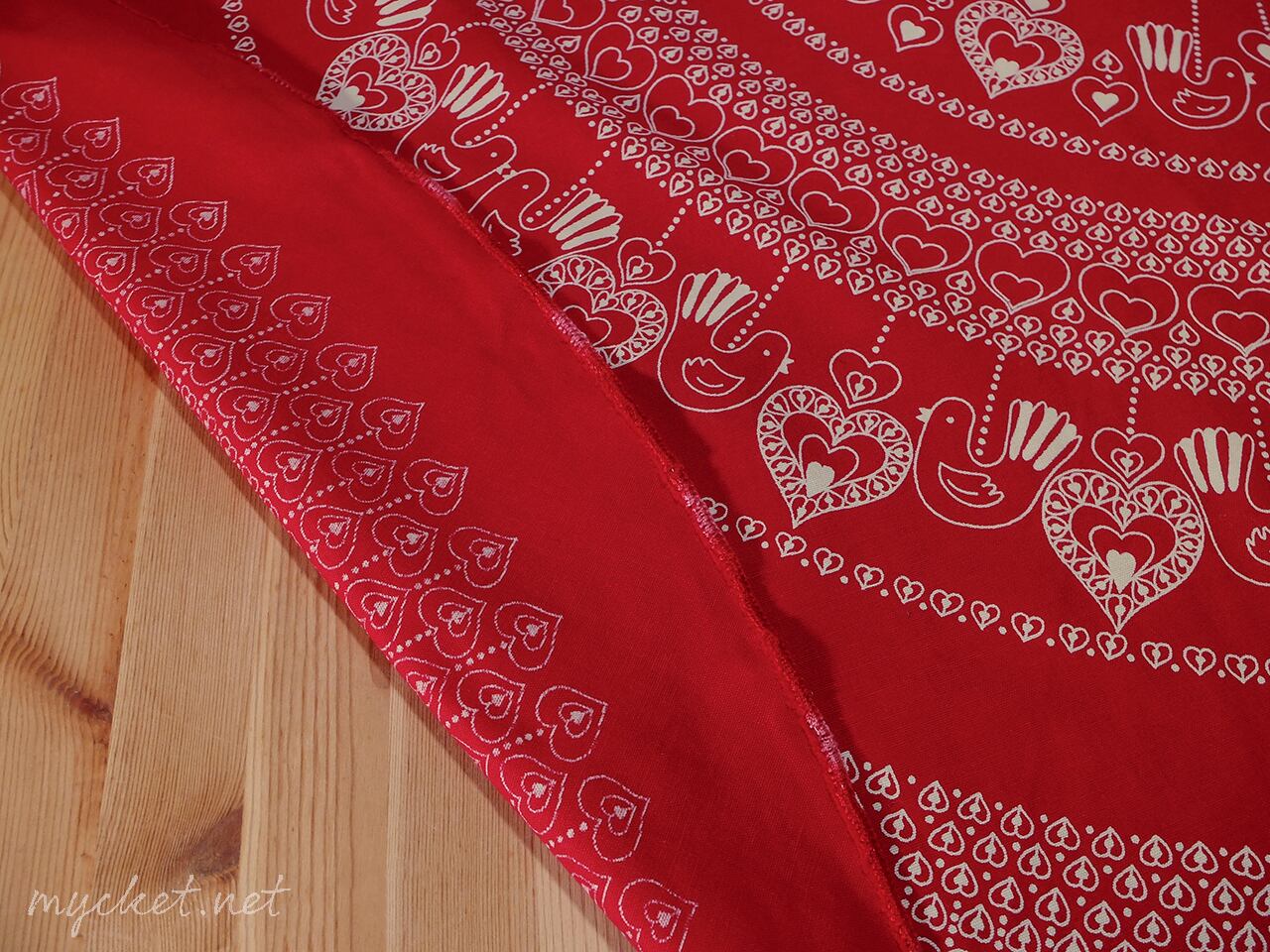 赤ベースに白で鳥とハートで構成されたオーナメントのような模様がデザインされています(プリント色は赤のみで、白はベースの色です)。
