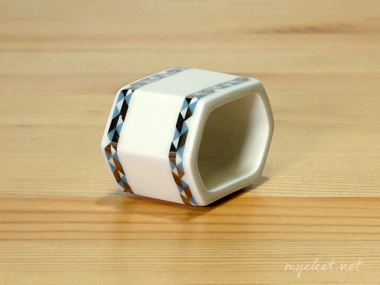 こちらのナプキンリングは落ち着いたブルーとゴールド(シルバー寄りにも見えます)の幾何学模様により、ラインがデザインされています。
