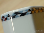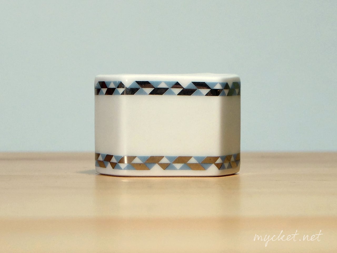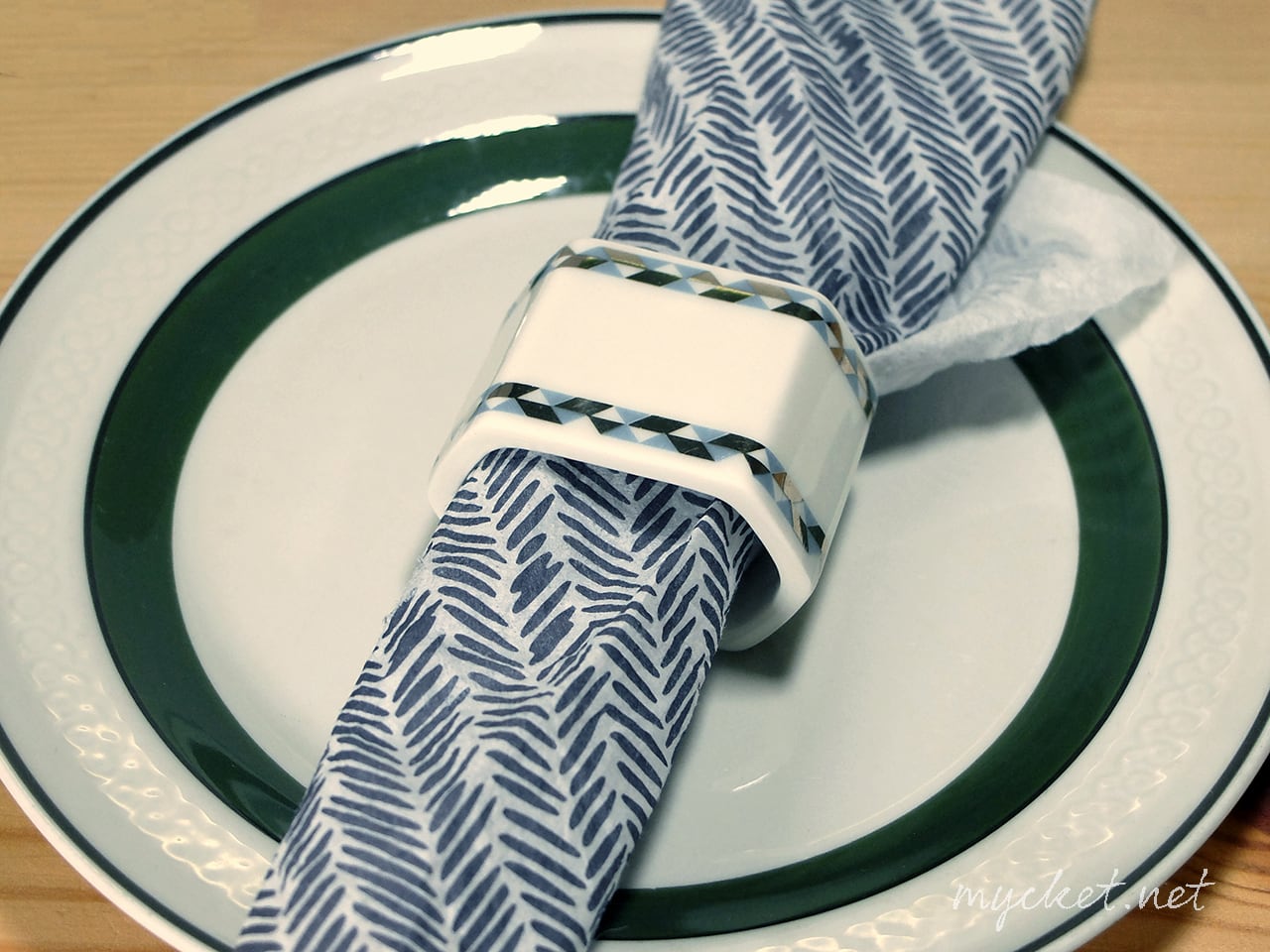 こちらのナプキンリングは落ち着いたブルーとゴールド(シルバー寄りにも見えます)の幾何学模様により、ラインがデザインされています。