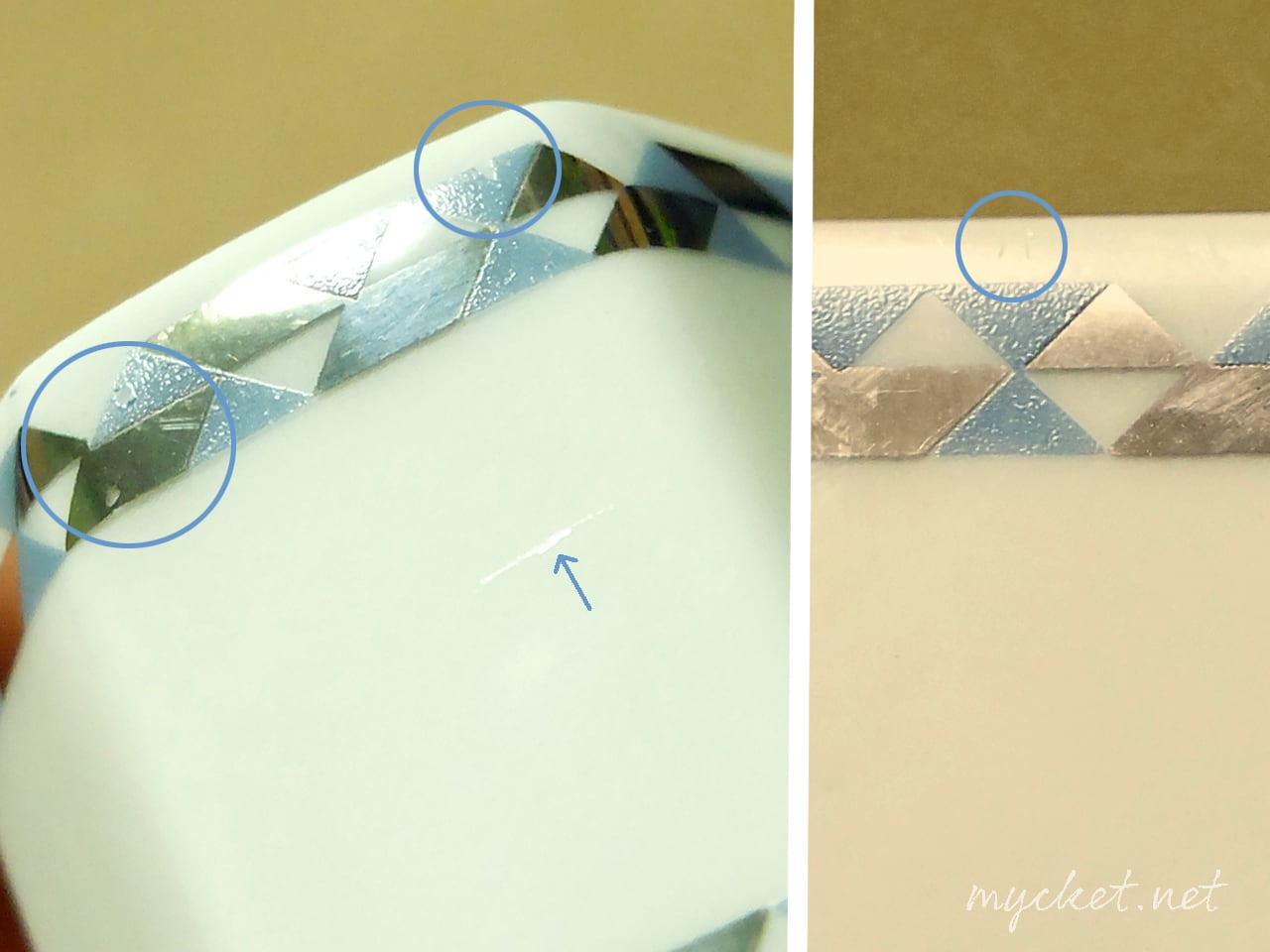 ・表面の模様の部分に、細かい剥がれや小キズが見られます(7・8枚目の画像)。