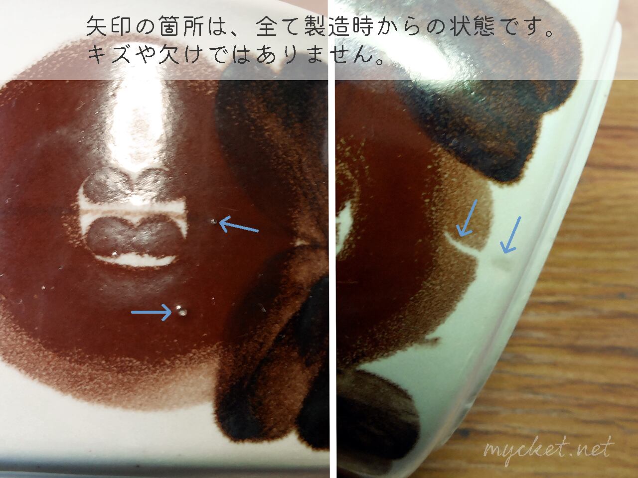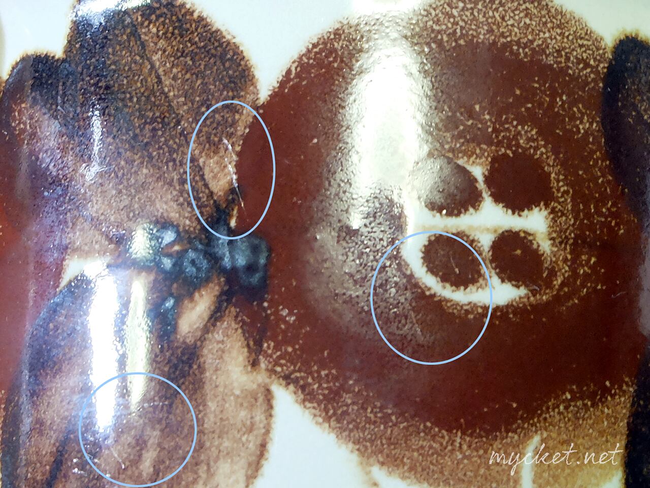 ・絵付け部分の小さな穴(ピンホール)や削れのような部分(10枚目の画像)。