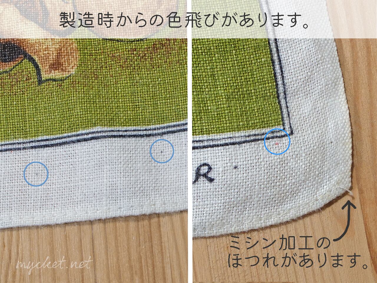 ・ミシンで三つ折り加工されている部分が一部ほつれています(8・11枚目の画像)