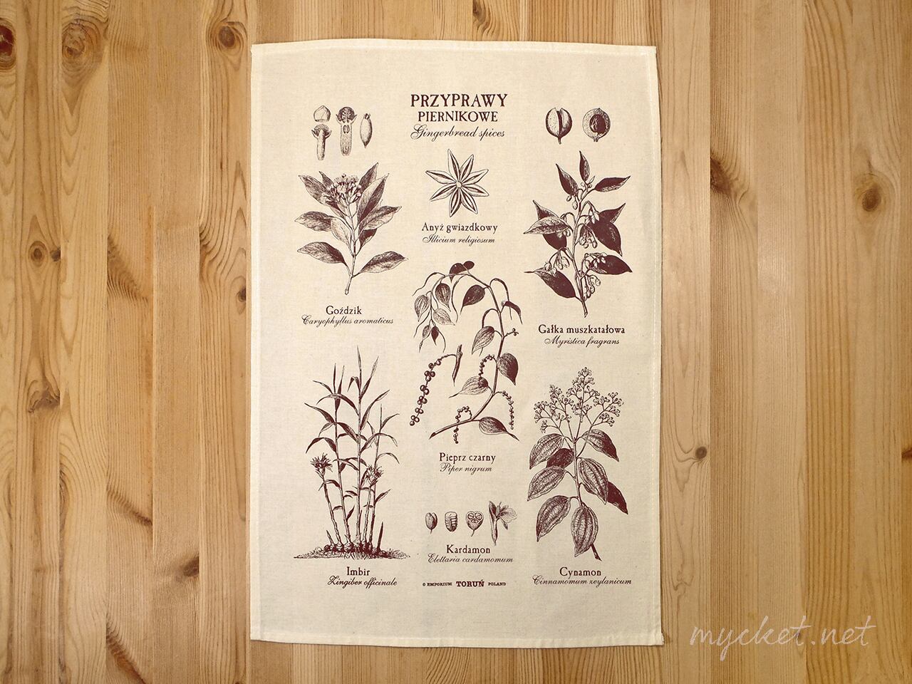 ポーランド「ジンジャーブレッドスパイス柄」クロス(ユーズド/Torun/Poland/Przyprawy Piernikowe/植物柄)