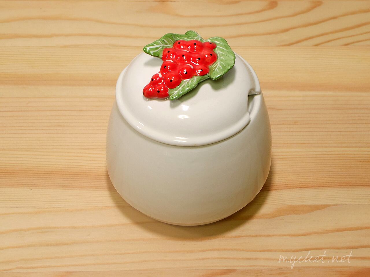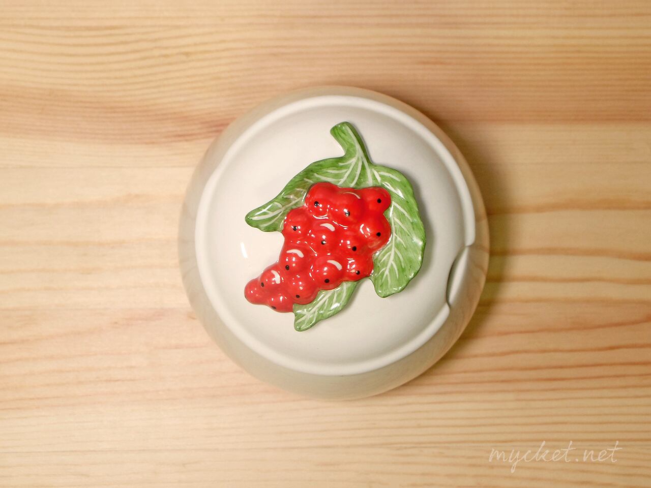 コロンとしたフォルムに、蓋の立体的な赤スグリ(レッドカラント)が印象的なデザイン。