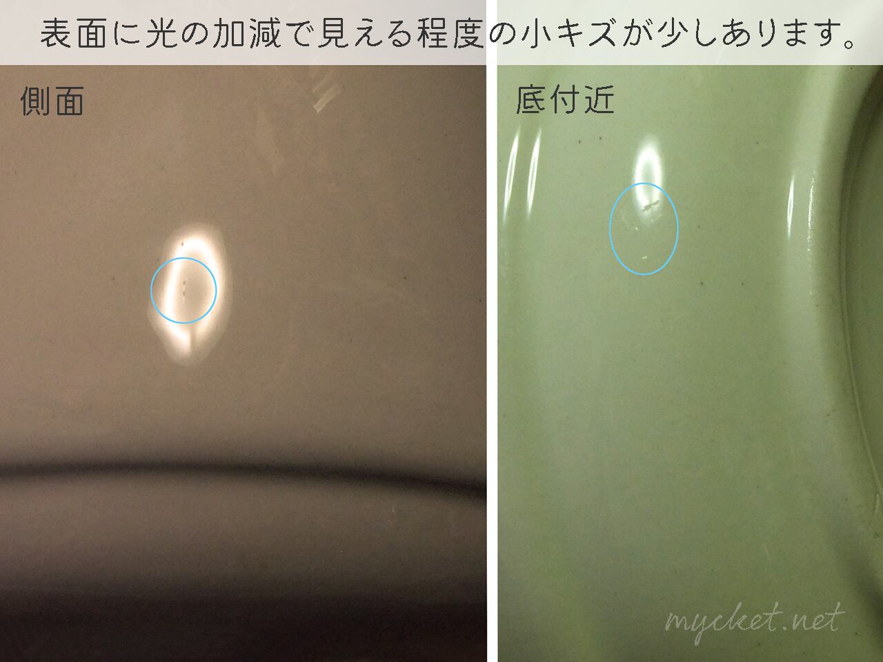 ・側面・底付近・蓋と接するフチ部分に、光の加減で見える小キズが僅かに見られます(8・9枚目の画像)。