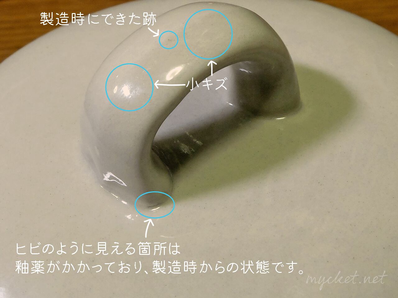 ・蓋の持ち手に、光の加減で見える小キズがあります(10枚目の画像)。