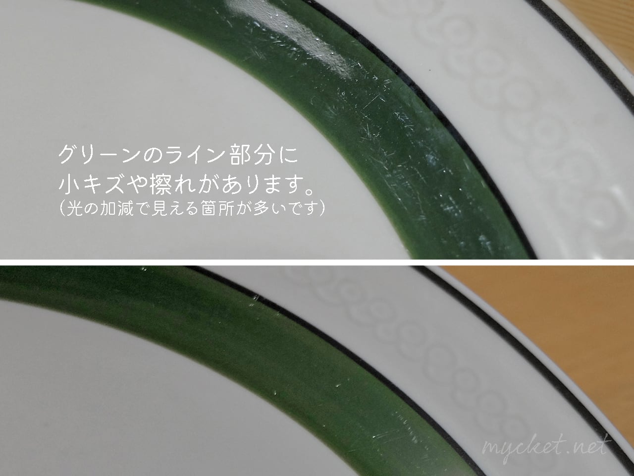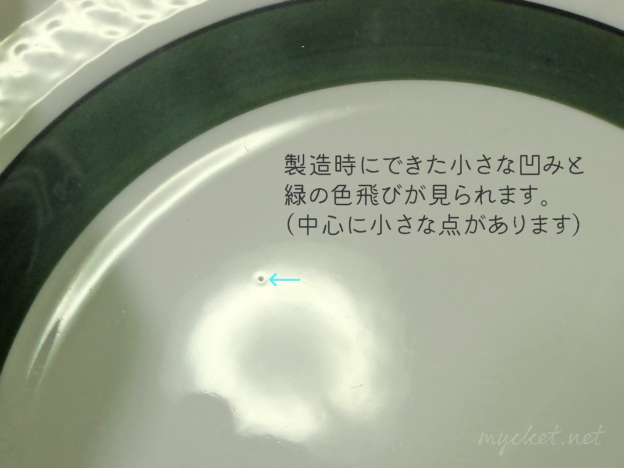 ・表面に小さな凹みと緑の色飛びがあります(7・8枚目の画像)
