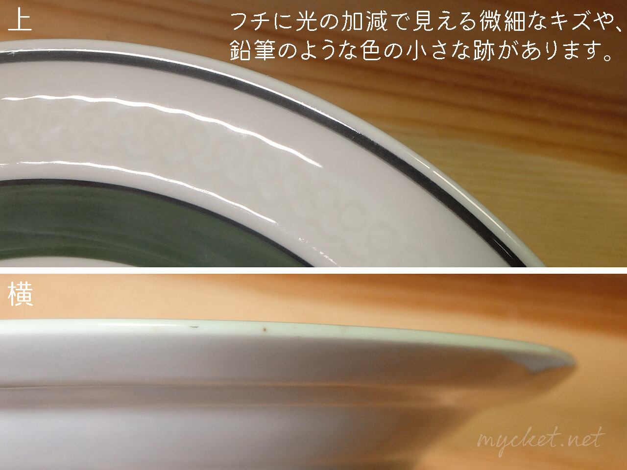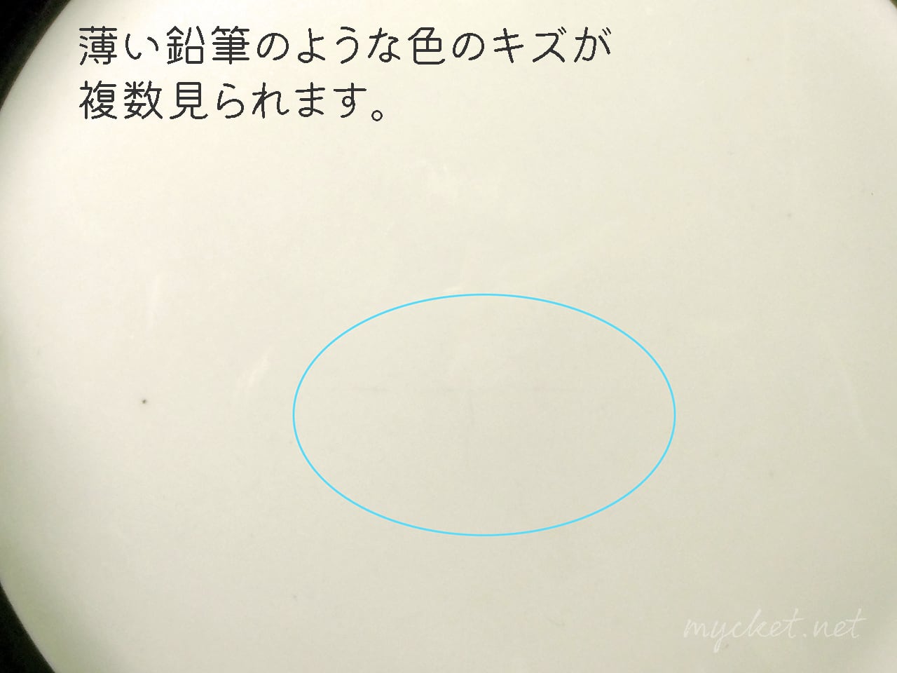 ・フチに光の加減で見える微細なキズと、鉛筆のような色の跡があります(12枚目の画像)
